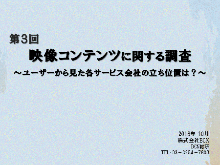 BCNでは、2016年10月に<第3回映像コンテンツ調査><教育現場のICT化に関するアンケート調査><パソコンソフト購入実態調査>、以上3つの調査を実施いたします。 映像コンテンツ調査では、ユーザーから見たコンテンツサービスの競合はについて、調査をする予定です。