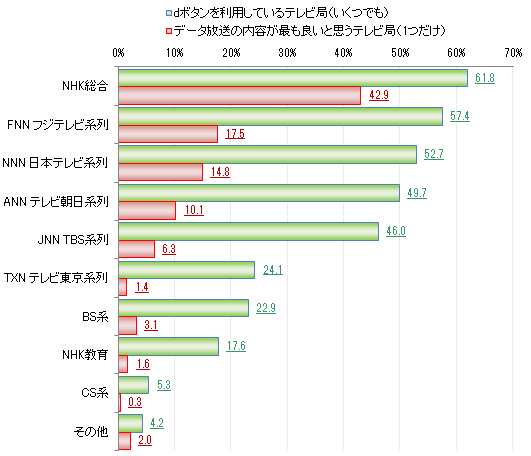 dボタンを利用しているテレビ局で、最も比率が高かったのが「NHK総合」(61.8%)。以下、主要民放4局である「FNN フジテレビ系列」(57.4%)、「NNN 日本テレビ系列」(52.7%)、「ANN テレビ朝日系列」(49.7%)、「JNN TBS系列」(46.0%)の順で続いた(図1)。またそれらのデータ放送のうち、最も内容が良いと思う局でも、「NHK総合」が42.9%でトップとなり、以下の順位も利用率と比例する結果となった。