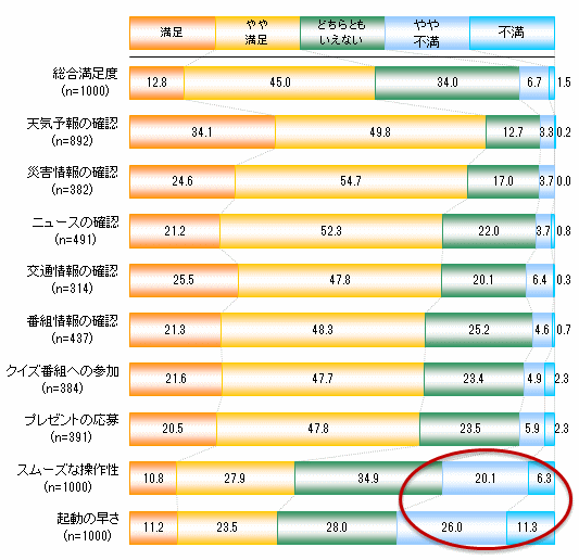 データ放送を利用するうえでの項目別満足度と、それらを踏まえた総合満足度を質問。総合満足度では57.8%の人が満足(「満足」と「やや満足」の合計比率)であると回答している(図2)。項目別では、天気予報の確認やニュースの確認、クイズ番組への参加など、データ放送のコンテンツに関する項目は満足度が高い。一方で、スムーズな操作性と起動の早さは、他の項目に比べて、不満の比率が多い。