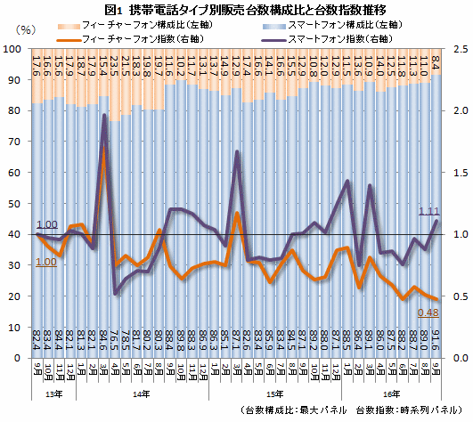 13年9月の販売実績を「1.00」とした指数で、3年間の販売動向をみていくと、季節変動はあるものの、スマートフォンは直近の1年間は「0.5」~「1.5」で推移し、先月が「1.11」と比較的好調だった(図1)。一方、フィーチャーフォンは緩やかに右肩下がりで推移し、先月は「0.48」と3年前の約半分の規模に縮小している。またそれらの販売台数構成比は、フィーチャーフォンの販売台数減少に伴い、スマートフォンが比率を伸ばし、先月には過去最大の販売比率となる91.6%を記録した。