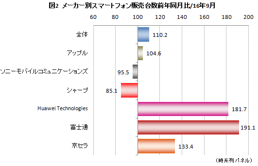 スマートフォンメーカー別に台数伸び率(前年同月比)を16年9月の販売台数上位6社に絞り算出(図2)。全体の伸び率110.2%を上回っているのがHuawei Technologies(以下Huawei、181.7%)、富士通(191.1%)、京セラ(133.4%)の3社。それらのメーカー別に販売台数の多い機種をみたところ、Huaweiは「P9 Lite」、富士通は「arrows M03」、京セラは「DiGNO E」となった。またこれらのキャリアは京セラがY!mobile、ほかの2社がSIMフリー端末であり、この3社はSIMフリー端末の比率が他のメーカーよりも高く、大手3キャリアの依存度が低い。これらから、フィーチャーフォン利用者が従来までの月額料金と同額程度でスマートフォンを利用するため、月額料金が比較的安価なMVNOやY!mobileなどに移行している傾向が強くなったことがスマートフォン台数比率増加の要因と言えるだろう。