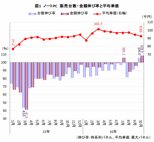 コンシューマー向けのノートPC市場で、販売台数伸び率(前年同月比)がほぼ2年半ぶりにプラスへと転じた。これは2014年3月と4月のWindows XPサポート終了に伴う駆け込み需要以来となる。その特需の反動で、翌15年3月には台数・金額とも伸び率は4割台にまで落ち込んだが、伸び率の落ち込みは月を追うごとに改善、この10月は久しぶりのプラスとなった。しかし、伸び率が好転したとはいえ、3年前の市場規模と比較すると7割程度に過ぎず、市場の縮小はようやく底を打ったと考えられる。平均単価は15年1月の7万7200円から上昇を続け、約一年後の16年3月は10万1700円に達した。その後、落ち着きを取り戻し、10月は9万3000円となり、平均単価の下落も市況好転を後押ししたと言えるだろう。