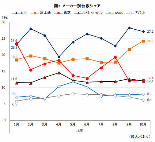 低迷が続いたノートPC市場が回復、この10月は2014年4月以来、ほぼ2年半ぶりの台数前年比プラスとなった。平均単価も徐々に値頃感を増してきたことも、市況好転につながった。メーカー別の動きを見ると、NECと富士通の合計シェアが5割を超えており、競合メーカーに比べて2倍近い高単価製品を展開しているにもかかわらず、国内メーカー勢の強さが際立っている。