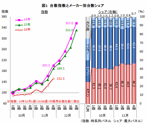 IJP市場の過去3年における、10月1週から12月4週までの3か月間にわたるMFPの台数指数を図1左に示した。この台数指数は2014年10月1週(14年10/6-10/12)の販売台数を「100.0」として算出したもの。毎年11月3週(14年11/17-11/23、15年11/16-11/22週、16年11/14-11/20週)から12月4週にかけ、IJP市場は年間を通じて販売台数が最も多くなる時期だ。しかし、16年は10月1週(16年10/3-10/9)の時点で既に14・15年を下回っており、11月4週(16年11/21-11/27)でも台数指数は、152.3と14年の201.5や15年の189.5より低い水準で厳しい状況が続く。