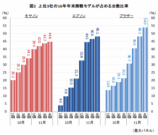 図2は、上位3社が16年8-10月に発売した年末商戦用の新モデルが、それぞれのメーカー内で占める割合をあらわしている。年末商戦モデルの比率は週を追うごとに増加していることが分かる。10月は、3社とも旧モデルや型落ちモデルが市場をけん引していたが、その後、新モデルへとシフトしている様子が明らかだ。11月に入ると、3社とも新モデルの比率が4割を超え、切り替わりが進んでいることを示している。ただし、キヤノンはエントリーモデルの「PIXUS MG3630」を前年から引き続き販売し、一定の台数比率を保っているため、他の2社よりも新モデルの比率が若干低くなっている。