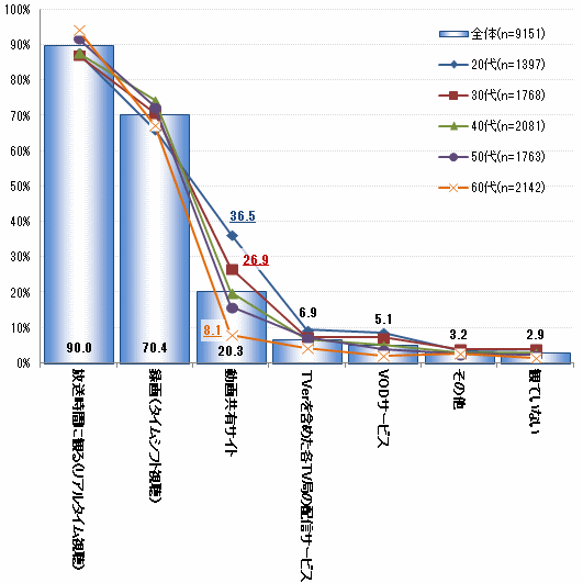 一方、インターネットを介したテレビ番組視聴では、年代別に顕著な違いがみられた。まず、YouTubeなどの「動画共有サイト」の視聴率で、60代は10%に満たないが、30代は26.9%、20代は36.5%と若年層になるほど比率が高くなる傾向があらわれた。全体の回答数こそ少ないが、「TVerを含めた各TV局の配信サービス」や「VODサービス」も同様の傾向を示しており、若年層のテレビ番組視聴ではテレビに限らず、インターネットを介した視聴など多岐にわたっている。