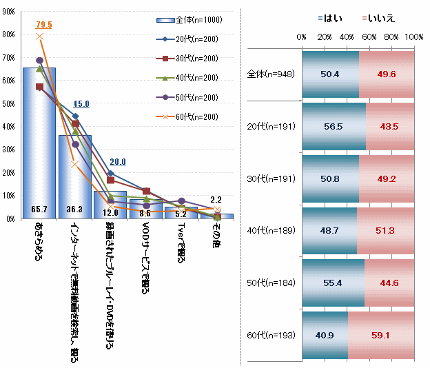 近年はインターネットサービスだけではなく、レコーダーの録画機能も進化。全録機能を搭載したレコーダーなどテレビ番組の見逃しを防止する製品も増えているが、番組を見損ねてしまう人はいまだ多いだろう。そのような場面に遭遇した際、どのような対応を取るのかを聞いたところ、「あきらめる」が65.7%でトップとなり、60代では79.5%と突出している(図2左)。年齢が高くなると、見逃したテレビ番組の視聴も「あきらめる」比率が高い。半面、年代が若いほど、あらゆる手段で見逃した番組を視聴する意欲が強いようだ。