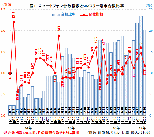 2014年2月の販売台数を「1.00」とした台数指数をみると、翌3月の消費増税前に発生した駆け込み需要により、2.22を記録した(図1)。この反動減は大きく、4月には0.58まで落ち込んだが、その後、市場は回復に向かっていた。「実質0円販売」の規制強化に伴い、市場は減速したものの、16年6月以降販売台数は再び右肩上がりで推移している。また16年2月以降、キャリアに縛られないSIMフリー端末の台数比率が増加し、市場を支えている。14年は1割に満たない水準で推移していたが、15年には1割前後、16年には1割台半ばと年々その比率は増加、16年12月からは3か月連続で2割台を維持し市場の回復に貢献している。