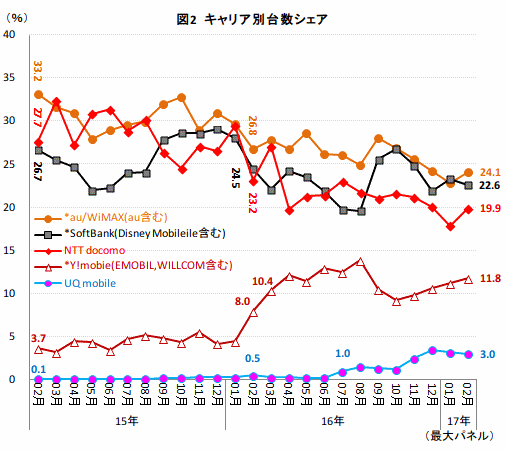 次にキャリアごとの台数シェアを算出したところ、3大キャリアの支配力が低下していることが分かった。2年前の14年2月時点では、au/WiMAXが33.2%、NTT docomoが27.7%、SoftBankが26.7%と3大キャリアの合計は87.6%を占めていた(図2)。この3大キャリアの合計シェアは、15年2月が74.5%、17年2月は66.6%と、年々10ポイント程度低下している。そうしたなか、SoftBankとauのサブブランドである、Y!mobileとUQ mobileがシェアを伸ばし、存在感を示している。この2キャリアはMVNO事業者と異なり、一部契約の縛りが存在するなどの制約はあるものの、3大キャリアよりも安価な月額料金が特徴だ。