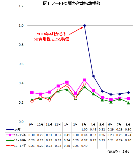 2014年4月の消費増税およびWindows XPのサポート終了以降、販売台数の減少が続いていたノートPC市場。それから約3年が経過した今、回復の兆しが見えてきた。家電量販店・ネットショップの実売データを集計する「BCNランキング」によると、16年12月から4か月間連続で、販売台数が前年同月比(伸び率)がプラスで推移。明るさを取り戻しつつあるが、市場規模は消費増税以前のレベルにはない。底を打ち始めた今こそ、復活に向けての正念場となる。