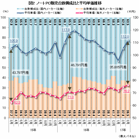 また、NECや富士通を始めとする国内メーカーが販売台数構成比で6割強を維持し続けている点にも注目したい(図2)。国内メーカーの平均単価は10万円から11万円前後を推移しているのに対し、ASUSやアップルなどの海外メーカーの平均単価は7万円前後。月にもよるが、国内メーカーと海外メーカーで約3-4万円の価格差が生じている。非常に大きな差に感じるが、それでも国内メーカーが支持されるのは、安心感と店頭での販売訴求の仕方に違いがあるためと考えられる。価格も重要な要素ではあるが、この市場においては、いまだそれらの影響度が大きい。
