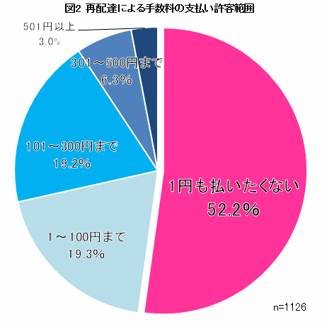 最近では、その必要不可欠である再配達を有料化する対策案も、宅配業者から出ている。そこで、再配達による手数料が発生する場合、どの程度の料金が許容範囲かを質問(図2)。やむを得ず再配達を依頼するケースもあるためか、52.2%が「1円も支払いたくない」と回答し、半数以上が再配達を依頼する際に、料金を支払う意思がないことが分かった。支払い意思がある人でも、「1~100円まで」の低額が高い割合を占めており、仮に再配達を有料化しても、高い料金設定は利用者の減少に繋がる恐れがあることを示している。