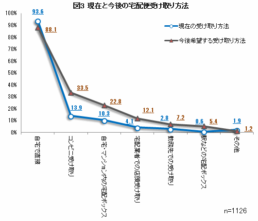 再配達を有料化するほかに、荷物の受け取り方法が多様化することで負担軽減を目指す動きもあるが、現状では「自宅で直接」受け取る人が9割以上となっている(図3)。これに合わせて、今後希望する受け取り方法を聞いたところ、「コンビニ受け取り」(33.5%)や「自宅・マンション内の宅配ボックス」(22.8%)など、再配達を必要としない方法が支持されつつある一方、今後の受け取り方法としても「自宅で直接」が88.1%で、圧倒的に比率が高い。