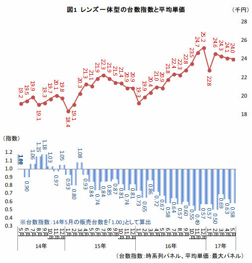 2014年5月の販売台数を「1.00」として、レンズ一体型の台数指数を算出したところ、15年3月までは前年とほぼ同じ水準を維持できていたことが分かる(図1下)。15年4月から連続して前年実績を下回り始め、月を追うごとにマイナス幅は大きくなった。16年11月には「0.49」と約2年半の間に市場規模は半分にまで縮小、その後、若干戻すも17年5月は「0.58」にとどまり、依然として厳しい状況に陥っている。台数指数と平均単価の動きをみると、指数が落ち込み始めた時期と平均単価の上昇し始めた時期がほぼ一致しており、販売減は平均単価の上昇と関連が強いことが分かった(図1上)。