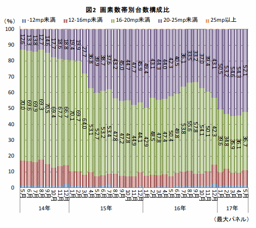 そこでレンズ一体型の画素数帯別の台数構成比(図2)を算出してみると、平均単価が上昇し始めた15年3月に「20-25mp未満」(2000-2500万画素未満)の比率が増加し始めており、高画素化へのシフトが単価上昇を招いた、とみてよさそうだ。しかし、「20-25mp未満」が5割を超えた17年1月から高画素化も止まっている状況だ。