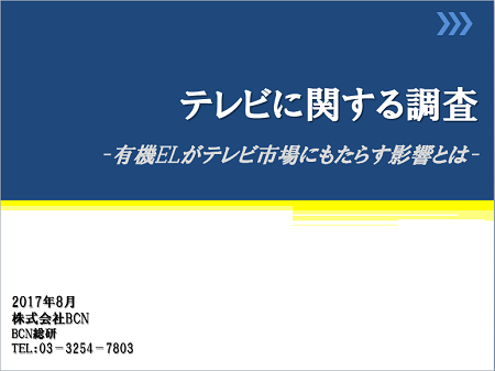BCNでは、2017年8月に<テレビに関する調査><第5回 セキュリティソフト調査><法人向け、防犯システムに関する調査>を実施いたします。テレビに関する調査では、日本のテレビメーカー各社が有機ELを搭載したテレビの販売を開始したことに合わせ、テレビの所有状況や買い替え意向、有機ELテレビの認知・ニーズについて探ります。