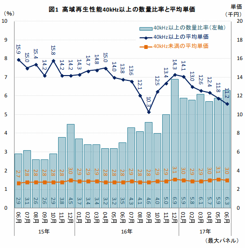 近年よく耳にするようになったハイレゾ対応。日本オーディオ協会によると、高域再生性能が40kHz以上であることを、スピーカー・ヘッドホンにおけるハイレゾ対応機器と定義している。この定義に照らし、40kHz以上を対象とした販売数量比率を算出したところ、2015年6月時点ではわずか3%程度で、17年に入っても6%前後と緩やかな比率増にとどまっている(図1)。この比率が急速に増えない大きな要因として単価差が挙げられる。ハイレゾ非対応製品の単価はここ2年間、3000円前後で推移している。一方、ハイレゾ対応の単価は下落しているとはいえ、1万円を超えている。両者の価格差は3倍以上。この単価差がハイレゾ普及の足かせになっており、現状ではさほど影響力はないと言える。