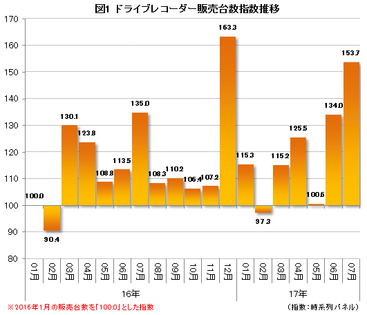 今から約1年半前の16年1月の販売台数を「100.0」とした指数でみると、16年3月以降で「100.0」を割り込んだのは17年2月だけで、これ以外は好調に推移(図1)。特に17年6月は「134.0」、7月は「153.7」と、直近2か月の伸びは顕著だ。また、昨年12月以降は指数が2ケタ増で推移する月が多く、売れ行きが高まっていることを示している。
