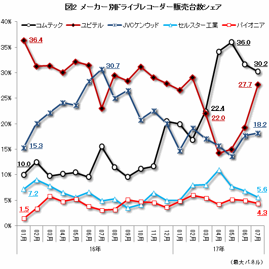 市場の拡大が進むなか、メーカーのシェア争いも激しくなっている。16年1月時点ではユピテルが36.4%でトップ、2位のJVCケンウッドとは20ポイント以上の差をつけていた(図2)。その後、両社の攻防は激化し、2強時代を彷彿させてきたが、今年に入ってからはコムテックが躍進。3月にトップシェアを奪取して以降、5か月連続で首位に君臨するようになった。ただ、主導権争いは始まったばかりで、いまは三つ巴の様相を示しはじめている状況だ。