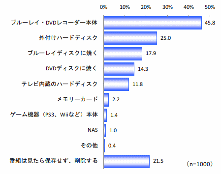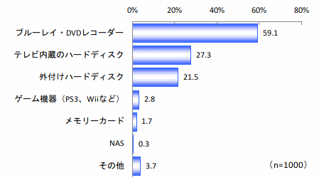 テレビ番組を録画する機器は、「ブルーレイ・DVDレコーダー」が6割近い59.1%と最も高い比率になった。以下、「テレビ内蔵のハードディスク」「外付けハードディスク」が2割台で続く。これはテレビに接続している機器の比率と連動していた。