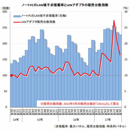 ノートPCにおけるLAN端子の非搭載率と、2014年9月の販売台数を「100.0」とするLANアダプタの台数指数をみると、2つの動きに相関があることが分かる。ノートPCのLANポート非搭載率が高まると、LANアダプタの台数指数も基点である「100.0」を上回るのだ(図)。17年3月以降のLANアダプタの動きをみると、両者の相関関係がより鮮明化しているだけでなく、売れ行きが飛躍的に高まっていることを示している。