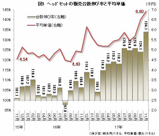 まず、過去2年における市場全体の販売台数伸び率(前年同月比)をみると、ほぼすべての月で好調な売れ行きが続いていることがわかる(図1)。とくに2016年12月からは前年比2ケタ増が多くの月で続いており、この11月は134.1%を記録。ここ数年では最大の伸び率となった。一方、平均単価は、これまで4000円台後半で推移してきたが、需要増が顕在化した1年ほど前から徐々に上昇。11月には7000円に迫る動きとなった。