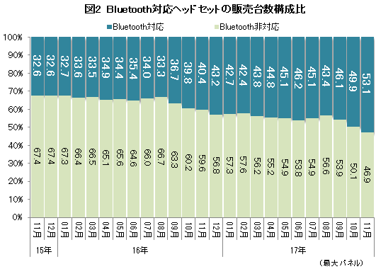 販売増と平均単価の上昇が同時に進んだのは、Bluetooth対応製品が一気に受け入れられたためだ。市場全体に占める対応製品の台数比率は、これまでは3割台であったが、徐々に比率は高まり、この11月は初めて5割を超えて53.1%となった(図2)。対応製品は非対応製品に比べて価格は高い。11月の平均単価で比較すると、対応製品は約1万円であるのに対し、非対応製品では4000円弱と2~3倍の開きがあることが、市場全体の単価を押し上げる要因となっている。