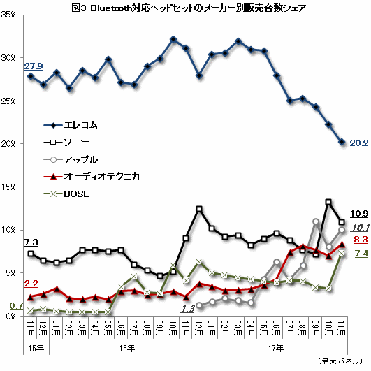 そこでBluetooth対応製品に限定し、メーカーシェアの推移を算出した(図3)。過去2年、トップシェアを守り続けているエレコムは今年6月以降、シェアを落としている。これはエレコム製品の売れ行きが鈍ったわけではなく、2位以下が大きく躍進してきたためだ。直近では複数のメーカーが1割前後までシェアを伸ばす混戦状態で、市場はまさに群雄割拠の様相を呈しているのだ。