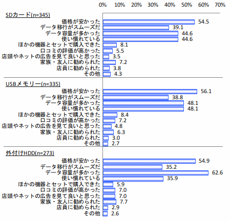 外部ストレージを利用している人に対し、そのストレージを利用する理由を聞いたところ、SDカードとUSBメモリーではそれぞれ「価格が安かった」の比率が最も高い。そして共に「データ容量が多かった」「使い慣れている」が2番目の理由。一方、外付けHDDでは「データ容量が多かった」が6割を超えており、「価格が安かった」が54.9%で続く。外部ストレージには大容量かつ安価であることが求められている。