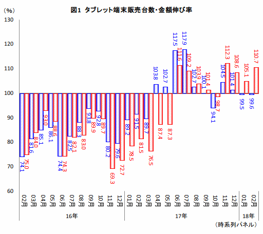16年2月から17年3月まで販売台数・金額ともに伸び率(前年同月比)は2ケタ減で推移していたタブレット端末だが、17年4月に台数、そして同年6月に金額伸び率でもプラスに転じた(図1)。この要因の一つは、Huawei Technologies(以下、Huawei)の「MediaPad T2 8 Pro Wi-Fi」の貢献が挙げられる。ただし、市場全体の伸び率がプラスに転じたのは、台数・金額が増加したというわけではなく、縮小していた販売がようやく下げ止まった、とみたほうが実情に合っている。