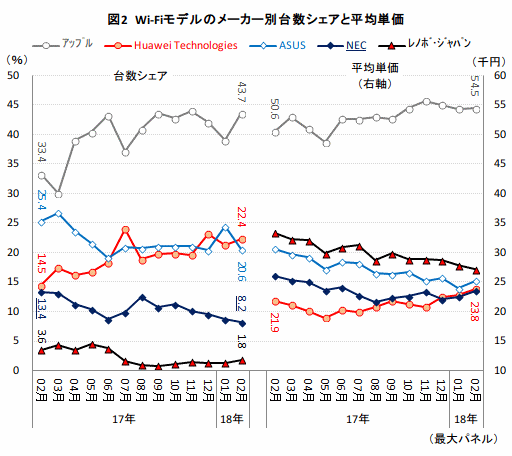 ではここから、17年通年で販売台数の7割を占めた「Wi-Fiモデル」に絞り込んで、その動きをみていこう。まず、メーカー別台数シェアと平均単価を算出してみると、依然としてアップルが4割を占めており、市場をけん引していることが分かる(図2左)。以前、ASUSの「Nexusシリーズ」がアップルの独走に歯止めをかけたことがあったが、再びアップルの独走が続いている。17年6月頃からASUSとHuaweiが2位争いを展開するようになり、18年2月ではHuaweiが約2ポイント差で三度2位となった。