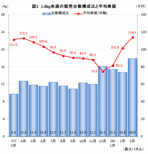 精彩を欠いているノートPC市場だが、1.0kg未満の軽量ノートPCに絞り込むと台数構成比は増加している。17年3月時点で市場に占める軽量ノートPCの台数比率は9.8%と約1割に過ぎなかったが、月を追うごとに増加、12月には16.2%に達した(図1)。その後、18年1月、2月は比率がやや低下したものの、3月には18.0%と過去3年間で最も高い比率となった。平均単価も17年3月から12月にかけて約4万円程下落していたが、それ以降は大幅な上昇に転じている。