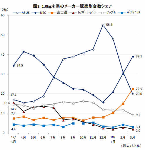 メーカー別台数シェアをみると、17年前半まではNECがトップだったが、8月からASUSが躍進、12月でのシェアは55.3%に達した(図2)。ASUSは2万円台半ばから3万円台前半の「VivoBook E200HA」や「VivoBook E203NA」が貢献しシェアを伸ばしたが、手頃な価格帯だったため、市場全体の軽量ノートPCの平均単価も押し下げていた。しかしその後、ASUSのシェアは18年に入って急落、この2月、3月ではNECや富士通が急伸している。NECは10万円前後の「LAVIE Note Mobile」シリーズ、富士通は20万円弱の「FMV-LIFEBOOK UH」シリーズといった高価格帯の製品群が売れ筋の上位になったことで、軽量ノートPCの平均単価は大幅な上昇につながっている。