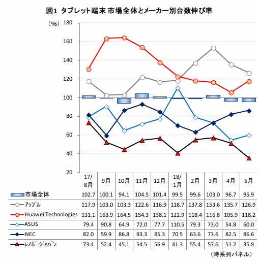 ここ10か月のタブレット端末市場の販売台数伸び率(前年同月比)をみると、ほぼ前年並みの水準を維持している(図1)。しかし、上位5メーカーの台数伸び率でプラスを維持しているのは、アップルとHuawei Technologies(以下、Huaweiと表記)の2社のみ。2社以外のASUS、NEC、レノボ・ジャパンは軒並み2ケタ減から半減といった深刻な状況となっている。18年3月まで2ケタ増で推移していたHuaweiも、徐々に勢いがそがれている状態だ。一方、アップルは17年12月から2ケタ増を維持している。これは第5世代iPad(17年3月発売)と第6世代iPad(18年3月発売)が大きく貢献したためで、とくに第6世代iPadが廉価になったこと、Apple Pencilに対応したことが影響していると考えられる。