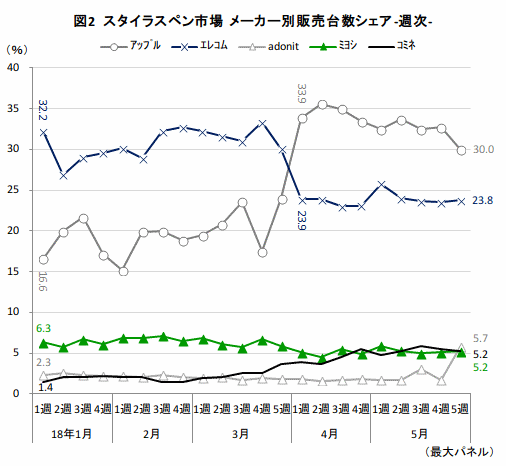 そこで、第6世代iPadの発売によるApple Pencilの動向を探るため、スタイラスペン市場における上位メーカーの販売台数シェアを週次で集計してみた(図2)。18年1月からエレコムは2位のアップルに10ポイント差をつけ、独走状態を維持していた。しかし、18年3月31日の第6世代iPad発売と連動して、4月1週にアップルのシェアは急伸、首位を独走するようになった。今まで、高額なiPad Proにしか対応していなかったApple Pencilであったが、対応機種が増えたことにより需要が増加。スタイラスペン市場でも、アップルのシェア増となっていることが一目瞭然だ。