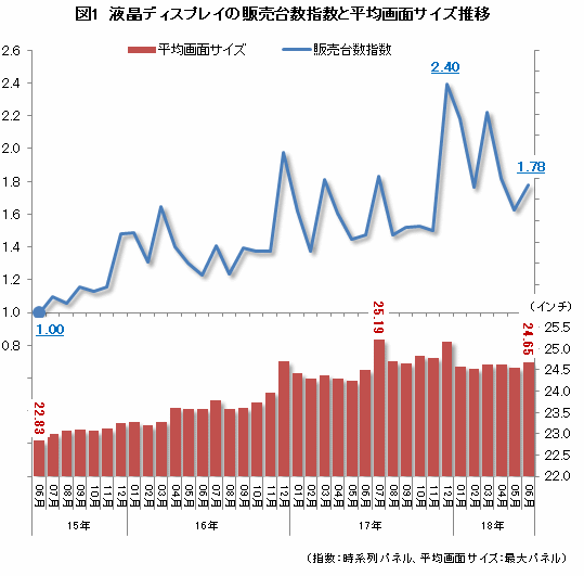 まず、過去3年の月別の市場動向をみるため、2015年6月の販売台数を「1.00」とした指数を算出した(図1)。その結果、1、3、12月に販売が伸びる季節変動をみせつつも、月を追うごとに指数は上昇。17年12月には「2.40」を記録し、直近の18年6月では「1.78」となっている。また、販売台数と相関するように、画面サイズの大型化も進んだが、17年7月の平均値である25.19インチをピークに、その後は大きな変化は現われていない。平均画面サイズは25インチ前後で落ち着く状況にある。