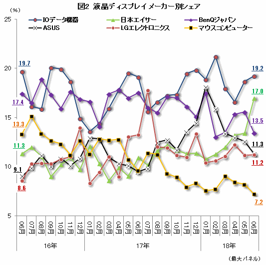 市場が好調に推移するなか、メーカーの激しいシェア争いが続いている。2年前の16年6月以降から上位メーカーの動きをみると、6社が10~20%前後でひしめき合っている(図2)。そのなかで、常にトップシェアを争っているのがIOデータ機器とBenQの2社。IOデータ機器は総合力と豊富なラインアップ、BenQは廉価モデルからゲーミング向けまでを取り揃えている強みがある。ただ、最近はIOデータ機器のトップが続いており頭一つ抜け出た存在となったが、後続勢の追い上げも激しい。日本エイサー、ASUS、LGエレクトロニクス、マウスコンピューターが上位をうかがう状況で、いつ形勢が逆転してもおかしくない。