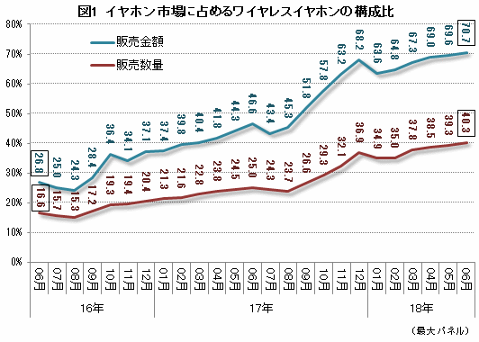 まず、イヤホン全体に占めるワイヤレスイヤホンの販売数量と販売金額の構成比を算出した(図1)。2016年6月ではわすが16.6%であったワイヤレスの数量比率は、2年後の18年6月には40.3%まで増大。金額比率も、26.8%から70.1%に急拡大している。イヤホン市場の主流はすでにワイヤレスへとシフトしていることを示している。