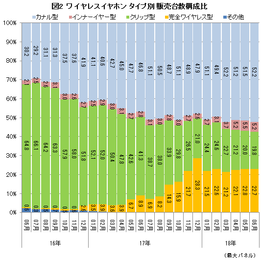 次にワイヤレスのタイプ別数量比率みると、この2年で大きく傾向が変化していることが分かる(図2)。16年夏までは約3分の2をクリップ型が占有。その多くが片耳のみの製品で、主に通話をメイン用途として利用する製品が主流となっていた。その後は徐々に、カナル型と完全ワイヤレス型の売れ行きが高まり、いずれも2年前に比べて構成比は20ポイント以上も上昇した。とくにカナル型は、18年に入ってからワイヤレスのなかで5割を占めて主役の座に躍り出たことになる。