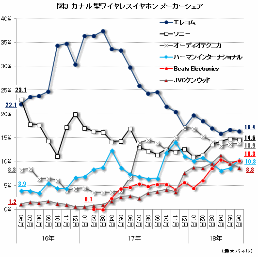 主役の座についたカナル型は成長ジャンルだけに競合は激しく、シェア争いが激化していることが分かる(図3)。2年前はエレコムとソニーでトップを争ったが、16年後半からはエレコムが豊富なラインアップと手頃な価格帯を強みに独走状態が続いた。しかし、17年9月のiPhone8/8 Plus発売を機に、各社ともカナル型に注力し、製品数が急増。ここ数か月は、数量シェア10%前後で6社がひしめく、混沌とした状況にある。