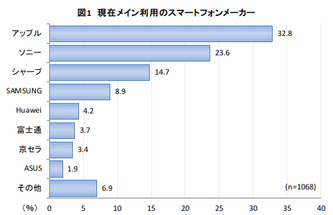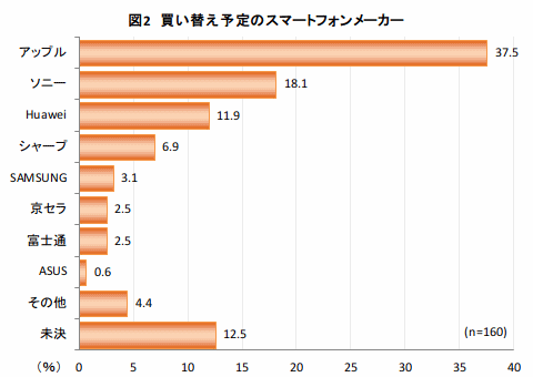 現在メインで利用しているスマートフォンのメーカーのトップはアップルで、32.8%と約3分の1を占めた。以下、ソニーの23.6%、シャープの14.7%と続く(図1)。年内にスマートフォンの買い替え意向を示しているのは15.0%にとどまったが、買い替え意向者の37.5%がアップルを予定しており、ソニー(18.1%)の2倍の比率となる(図2)。
