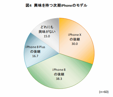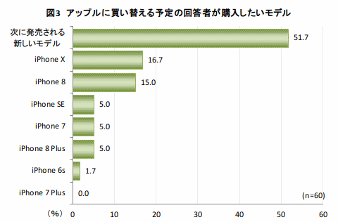 そこで、次にアップルに買い替えたいとした回答者に対し、どの機種を検討しているか質問したところ、「次に発売される新しいモデル」が51.7%と半数を超えた(図3)。次期モデル発売後も現行モデルは併売される見通しで、そのなかでは「iPhone X」が16.7%、「iPhone 8」は15.0%とそれぞれ1割を超える比率だった。価格が下がることが想定される現行モデルも、引き続き人気があることを示す結果となった。