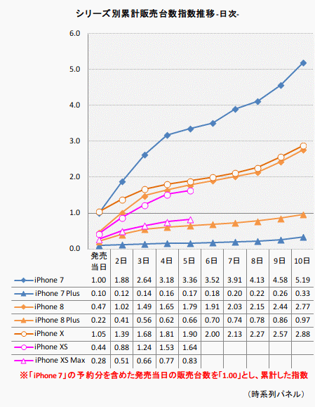 翌17年9月発売の「iPhone 8」では、発売当日は「0.47」と「iPhone 7」の半分にも満たず、初動は鈍かった。これは約2カ月後に上位機種の「iPhone X」が発売になることが分かっていたため、どちらを選択するか迷っている購入者が多かったことが影響したためだ。しかし、「iPhone 8 Plus」と「iPhone 7 Plus」が10日経過した時点で比較すると、前者は「0.97」であるのに対し、後者は「0.33」と差は3倍近く開いており、「iPhone 8 Plus」は好調な滑り出しをみせたといっていい。「iPhone X」は基準とした「iPhone 7」の販売を若干上回る「1.05」だったものの、生産が追い付かず、流通は在庫を確保できなかった。これが響き、出足は好調であったにもかかわらず、すぐに失速。10日後は「2.88」にとどまった。