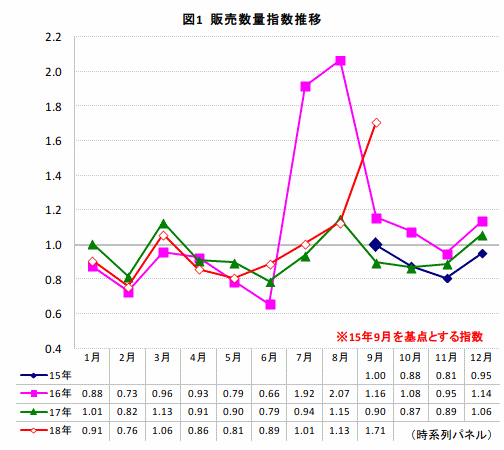 15年9月の販売数量を「1.00」として、モバイルバッテリーの3年(36か月)の動向を指数化した(図1)。16年6月までは、基点となる15年9月の販売数量を上回ることはなく、市場規模に大きな変化はみられなかったが、この3年の間に二度大きな伸びを示していることが分かった。まず、一つめの波はいまから2年前で、16年7月下旬に「ポケモンGO」のサービスが始まると、7月の指数は基点のほぼ2倍の「1.92」、翌8月は「2.07」に達し、需要は一気に拡大した。それ以降は、流通在庫の不足などの影響や、「ポケモンGO」のブーム沈静化に伴い、特需前の水準に落ち着くかたちとなった。そして、二つめの波となる18年9月の指数は「1.71」と、再び大きな伸びを示しているのだ。
