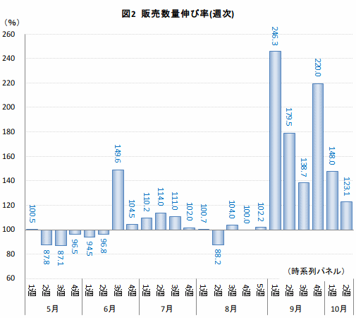 今回の波を引き起こした要因を探るため、18年5月以降の販売数量伸び率(前年同期比)を週ごとに算出したところ、6月の第3週(6/18-6/24の週)と9月以降で、それまでとは異なる動きをみせていることが分かった(図2)。まず18年6月第3週の伸び率が149.6%に急伸した要因としては、大阪府北部を中心に最大震度6弱の地震が発生したことが大きいと考えるべきだろう。そして、9月第1週(9/3-9/9)に246.3%と前年同期の2.5倍に達する勢いとなったのは、9月4日-5日にかけて関西方面で猛威を振るった台風21号の影響による停電に加え、最大震度7を記録した北海道胆振東部地震(9月6日)により、北海道での大規模停電の発生が、モバイルバッテリーの需要を押し上げる方向へと作用したとみていいだろう。