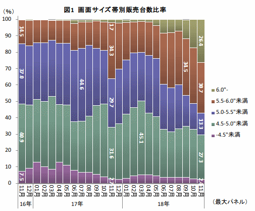 まず、大画面化の変遷について。画面サイズ帯別に算出した販売台数比率の推移をみると、2年前の2016年11月にはiPhone 7を含む「4.5-5.0"未満」が40.9%を占めて最大のボリュームゾーンだった(図1)。その後、17年6月にはHuawei Technologies(以下、Huaweiと表記)のP10 liteの発売で、「5.0-5.5"未満」のゾーンが増加する。しかし同年9月のiPhone 8の発売で、再び「4.5-5.0"未満」が盛り返したものの、17年10月までは大画面化の動きは比較的緩やかなものだった。その後iPhone Xの発売(17年11月)をきっかけに、「5.5-6.0"未満」が34.3%に達したが、瞬間的な動きにとどまった。「5.5-6.0"未満」の比率が月を追うごとに増加したのは、18年6月に発売となったHuawei P20 liteがきっかけで、ここから本格的な大画面化が始まったと言ってよさそうだ。同年9月にiPhone XSによって「5.5-6.0"未満」は34.5%と、ここ数年では最大となった。11月にはiPhone XRを筆頭にXperia XZ3などが「6.0"-」の構成比をけん引、さらなる大画面化が進んでいる。