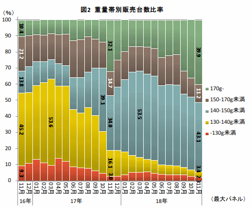 次いで重量化について。大画面化に伴い消費電力は増え、それによりバッテリーを大きくせざるを得ないことが、本体重量の増大化に直結しつつある。そこで、重量帯別販売台数比率をみていこう(図2)。2年前の16年11月から17年5月までは「130-140g未満」のゾーンが4-5割強を占めていたが、17年6月から「140-150g未満」が増加した。この要因はHuawei P10 liteと富士通 arrows Be F-05Jの発売だった。その5カ月後にはiPhone 8の発売により4割目前まで迫るものの、翌11月のiPhone X発売でさらに重い「170g-」の比率が急増した。その後は、iPhone 8の復調で歯止めがかかったが、18年6月以降はAQUOS R2とXperia XZ2、10月のiPhone XS、XRの発売で「170g-」の比率増が加速しており、今後も重量化の傾向は止まりそうにない。