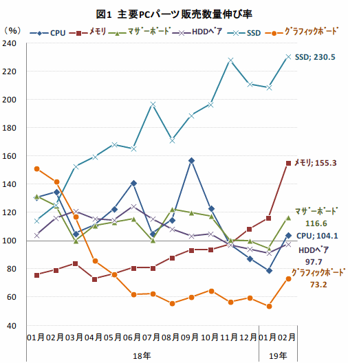 2018年1月から19年2月までの主要PCパーツの販売数量伸び率をみると、売れ行きにばらつきがあることが分かる(図1)。まず、SSDは集計期間中の全ての月で伸び率はプラスで推移しており、直近の19年2月は230.5%と前年の2倍以上の販売数量となった。メモリは前年割れで推移してきたが、基調は徐々に改善。18年12月にはようやくプラスに転じ、19年2月には前年比5割増の155.3%に達した。一方、プラスで推移していたCPUやマザーボード、HDDベアは、18年11月に揃ってマイナスへと後退。2月はマザーボードが116.6%と2桁増となったが、CPUは104.1%、HDDベアは97.7%とほぼ前年並みにとどまった。これに対して仮想通貨のマイニングブームの沈静化などで販売が鈍化したグラボは、18年後半から前年比60%程度と低調な推移となっている。