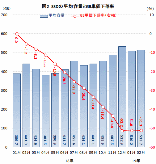 まず、SSDの単価を調べるため、18年1月の1GB当たりの単価(GB単価)を算出、この値を基準にした単価下落率を算出した(図2)。GB単価は毎月3-5ポイント程度コンスタントに下落し続け、18年12月にはマイナス51.2%と、一年で半値に達した後、ここ数カ月は横ばいで推移していることが分かる。次に平均容量をみると、GB単価の下落を背景に、18年春を境に400GB前後と大容量化が進み、GB単価が半値に達した18年12月には500GB台に突入。19年2月の平均は513.7GBと、ここ数カ月で約100GBも大容量化した。こうしたことから、GB単価の下落と大容量化が進み、SSD市場が活況を呈する大きな要因となっている。
