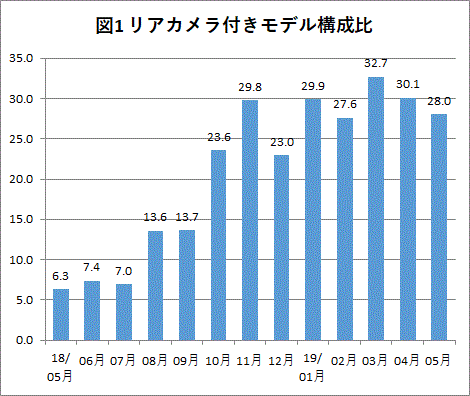 リアカメラ付きドライブレコーダーの販売台数構成比は、2018年5月の時点で6.3%に過ぎなかったが1年後の19年5月には28.0%と5倍近くまで拡大していることが分かった(図1)。また18年1月にBCNが実施したドライブレコーダー調査でこの販売台数構成比の伸びを予測するデータが示唆されていた(図2)。